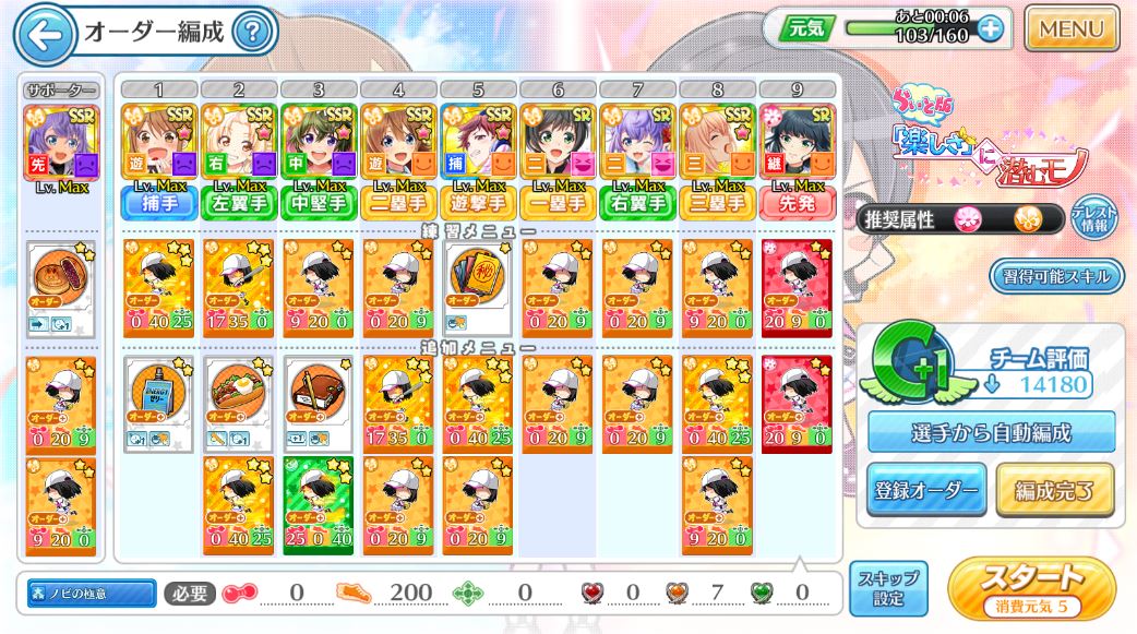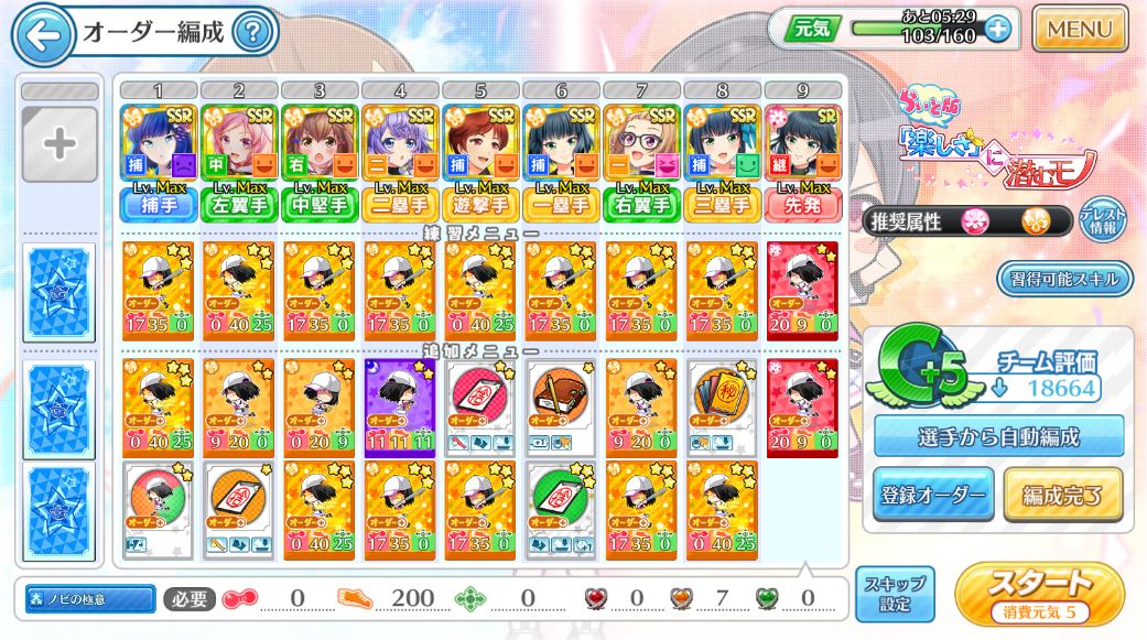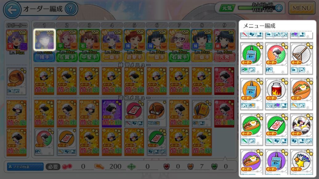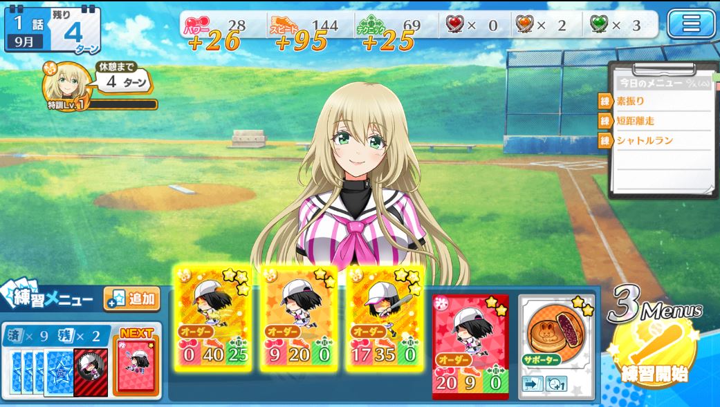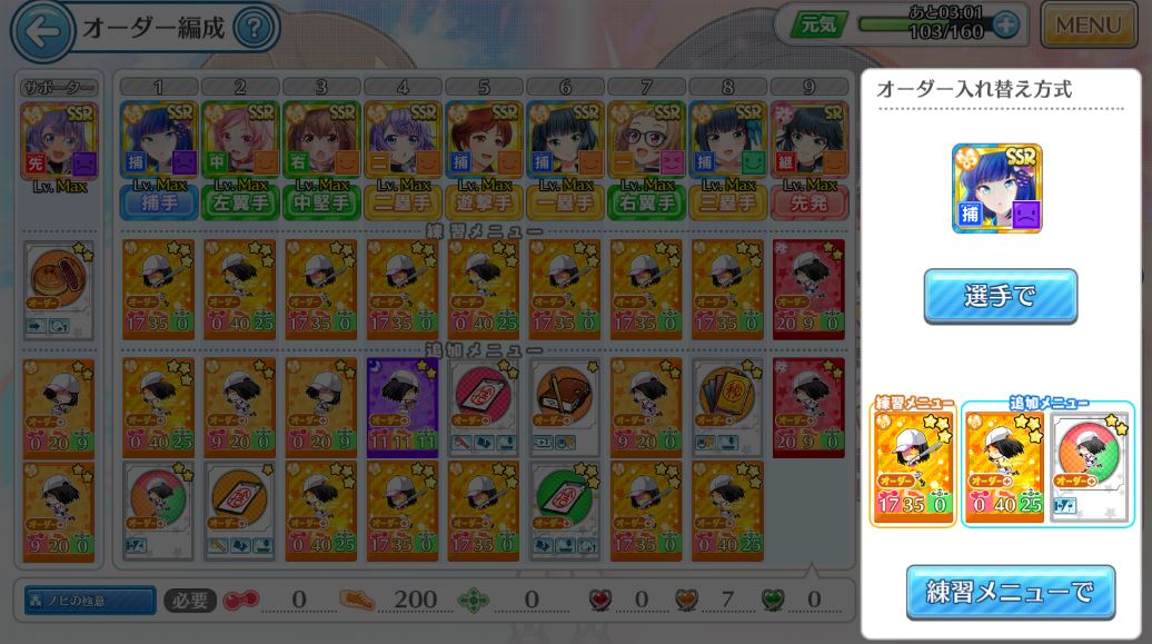 入れ替えたいキャラを選ぶとこんな感じの画面が出てくるので……「練習メニューで」のボタンを押します。