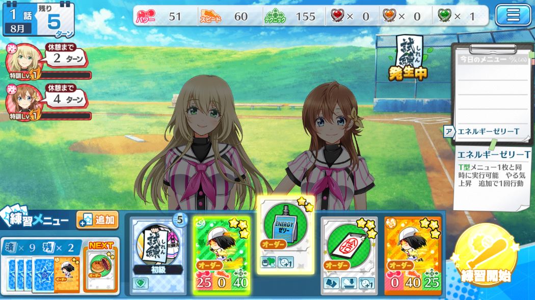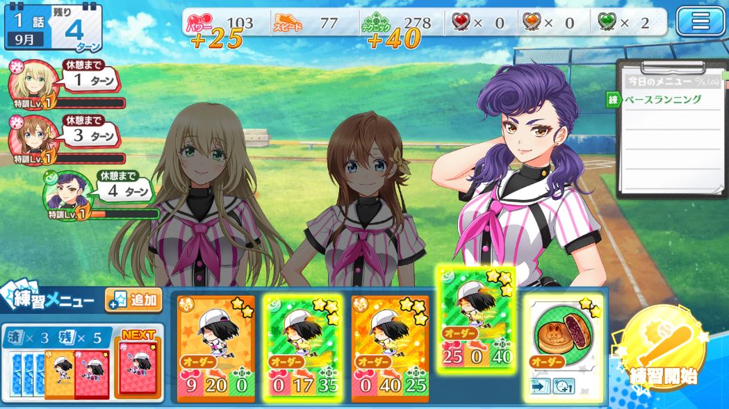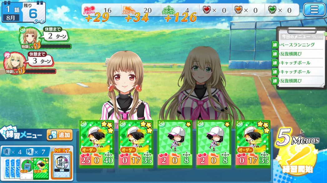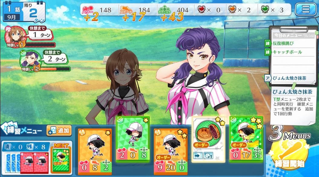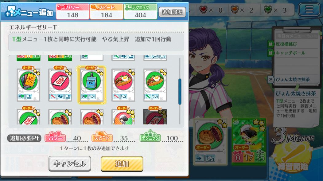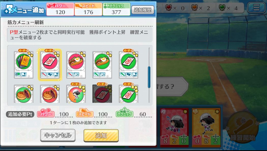 ただし、次の手番が想定できず事故も起こしやすいので、どうしても目先の特訓が攻略できるか不安がある場合はメニュー追加と合わせることで回避することもできます。