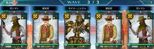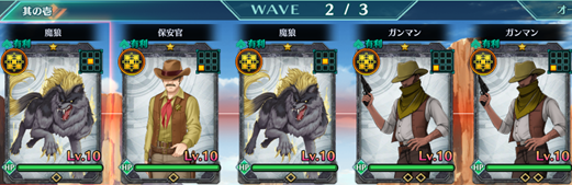 Wave2 | 魔狼:黄×2、保安官:黄×1、ガンマン:黄×2 |