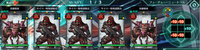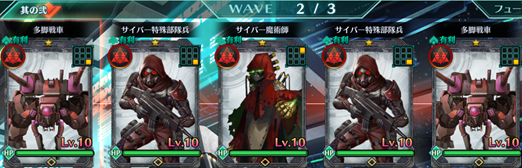 Wave1 | 多脚戦車:赤×2、サイバー特殊部隊兵:赤×3 |