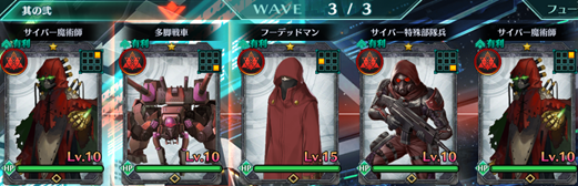 Wave3 | サイバー魔術師:赤×2、多脚戦車:赤×1、フーデッドマン:赤×1、サイバー特殊部隊兵:赤×1 |