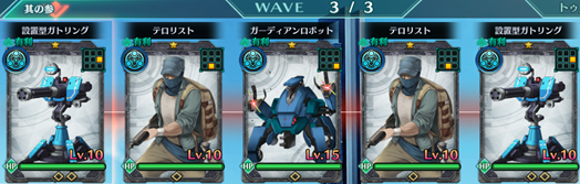 Wave3 | 設置型ガトリング:青×2、テロリスト:青×2、ガーディアンロボット:青×1 |