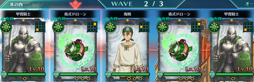 Wave2 | 甲冑騎士:緑×2、術式ドローン:緑×2、海賊:緑×1 |
