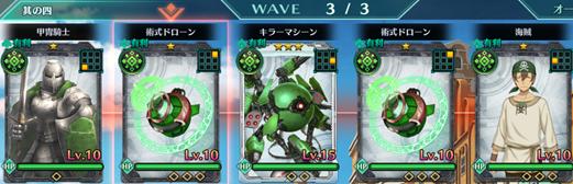 Wave3 | 甲冑騎士:緑×1、術式ドローン:緑×2、キラーマシーン:緑×1、海賊:緑×1 |