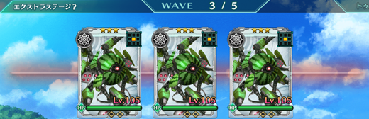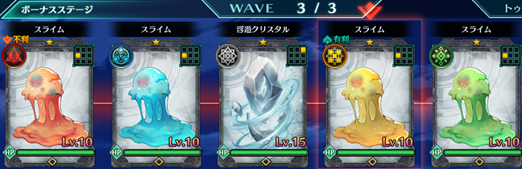 Wave3 | スライム:赤×1、スライム:青×1、浮遊クリスタル:無×1、スライム:黄×1、スライム:緑×1 |