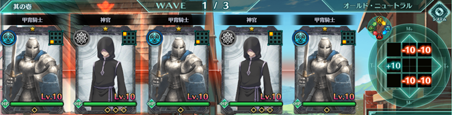 Wave1 | 甲冑騎士:青×3、神官:無×2 |
