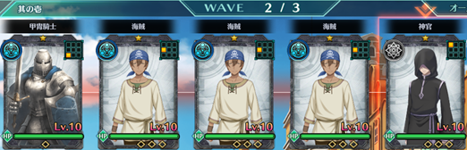 Wave2 | 甲冑騎士:青×1、海賊:青×3、神官:無×1 |