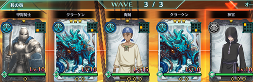 Wave3 | 甲冑騎士:青×1、クラーケン:青×2、海賊:青×1、神官:無×1 |