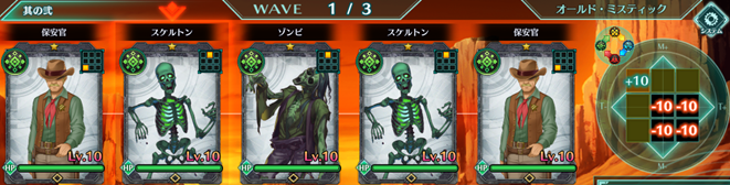 Wave1 | 保安官:緑×2、スケルトン:緑×2、ゾンビ:緑×1 |