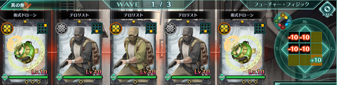 Wave1 | 術式ドローン:黄×2、テロリスト:無×2、テロリスト:黄×1 |