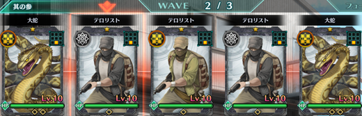 Wave2 | 大蛇:黄×2、テロリスト:無×2、テロリスト:黄×1 |