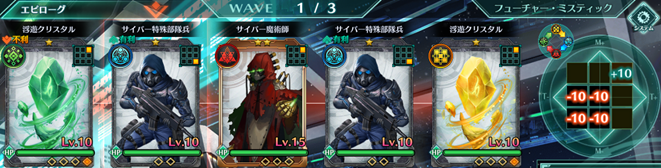 Wave1 | 浮遊クリスタル:緑×1、サイバー特殊部隊兵:青×2、サイバー魔術師:赤×1、浮遊クリスタル:黄×1 |