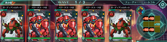 Wave1 | ガーディアンロボット:赤×2、パワードスーツ兵:赤×3 |