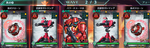 Wave2 | 術式ドローン:赤×2、設置型ガトリング:赤×2、パワードスーツ兵:赤×1 |