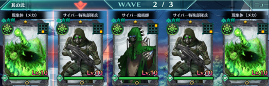 Wave2 | 現象体(メカ):緑×2、サイバー特殊部隊兵:緑×2、サイバー魔術師:緑×1 |