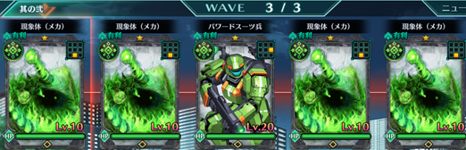 Wave3 | 現象体(メカ):緑×4、パワードスーツ兵:緑×1 |
