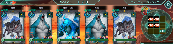 Wave1 | 魔狼:青×2、魔熊:青×2、現象体(獣):青×1 |