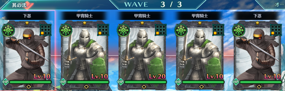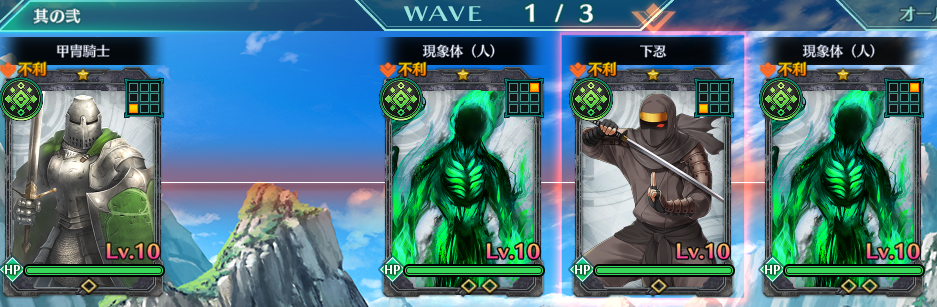 Wave1 | 甲冑騎士:緑 x1、下忍:緑 x1、現象体(人):緑 x2 |