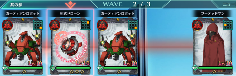 Wave2 | フーデッドマン:赤 x1、ガーディアンロボット:赤 x2、術式ドローン:赤 x1 |