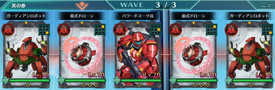 Wave3 | パワードスーツ兵:赤 x1、ガーディアンロボット:赤 x2、術式ドローン:赤 x2 |