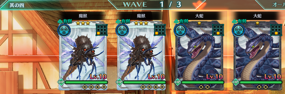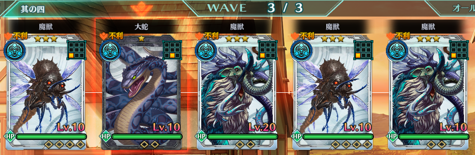 Wave1 | 魔獣(羽虫):青 x2、大蛇:青 x2 |
