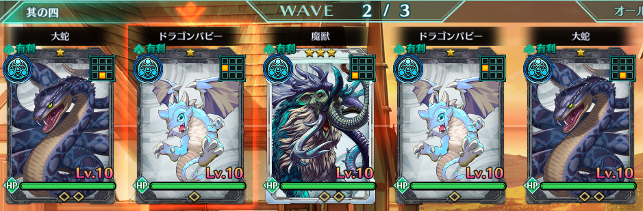 Wave2 | 大蛇:青 x2、ドラゴンパピー:青 x2、魔獣(象):青 x1 |