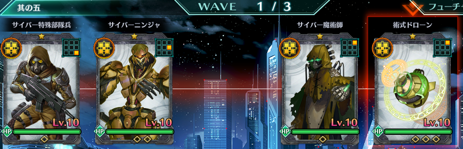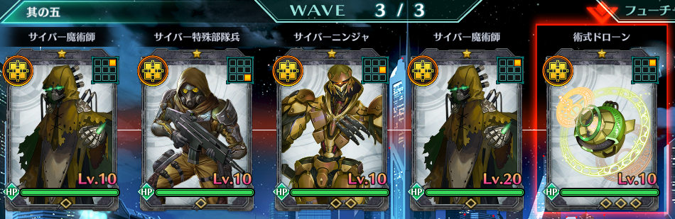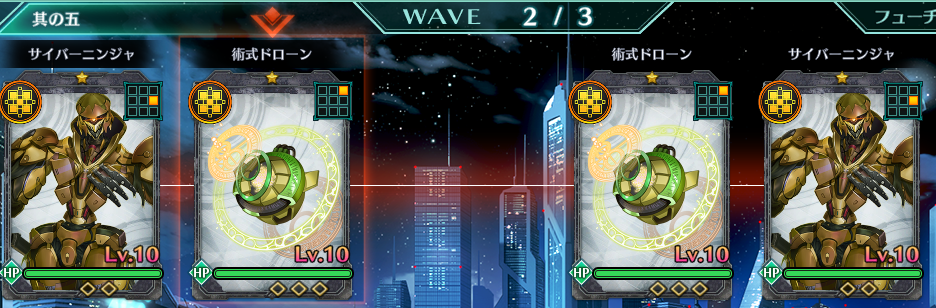 Wave3 | サイバー特殊部隊兵:黄 x1、サイバーニンジャ:黄 x1、 サイバー魔術師:黄 x2、術式ドローン:黄 x1 |