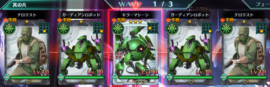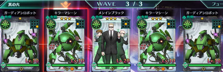 Wave3 | キラーマシーン:緑 x2、ガーディアンロボット:緑 x2、メンインブラック:緑 x1 |