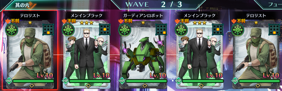 Wave2 | テロリスト:緑 x2、ガーディアンロボット:緑 x1、メンインブラック:緑 x2 |