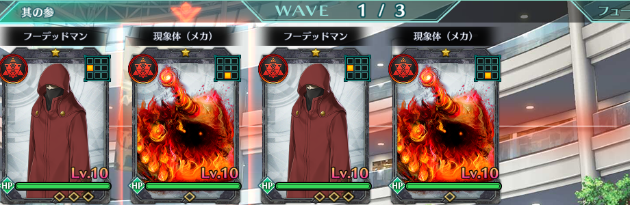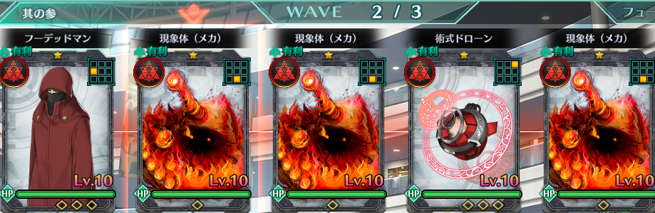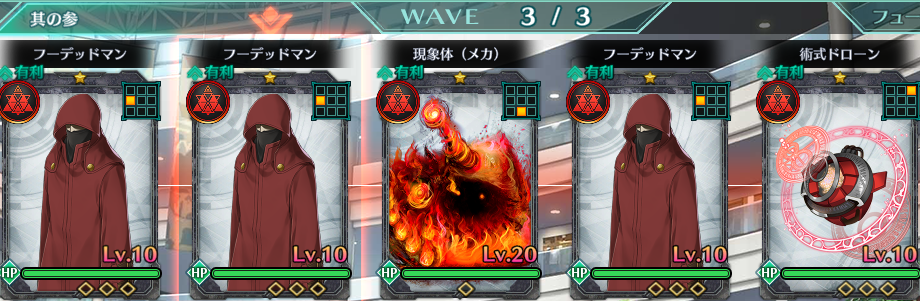 Wave3 | フーデッドマン(強):赤 x3、現象体(メカ):赤 x1、術式ドローン:赤 x1 |