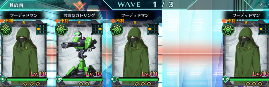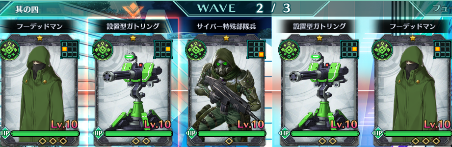 Wave2 | フーデッドマン(強):緑 x2、設置型ガトリング:緑 x2、サイバー特殊部隊兵:緑 x1 |