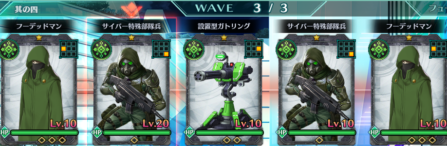 Wave3 | フーデッドマン(強):緑 x2、設置型ガトリング:緑 x1、サイバー特殊部隊兵:緑 x2 |