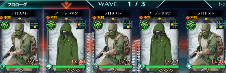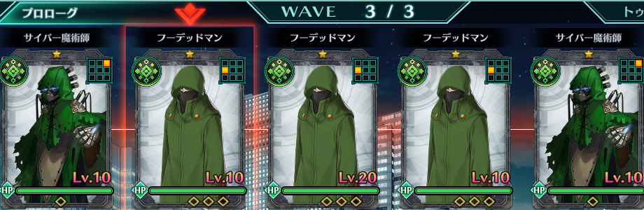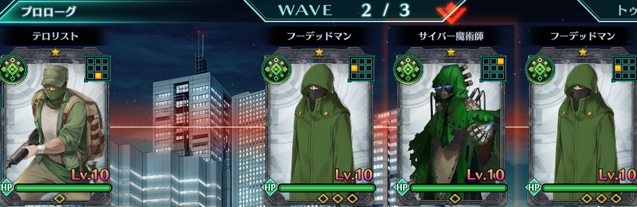 Wave2 | テロリスト:緑 x1、フーデッドマン(強):緑 x2、サイバー魔術師:緑 x1 |