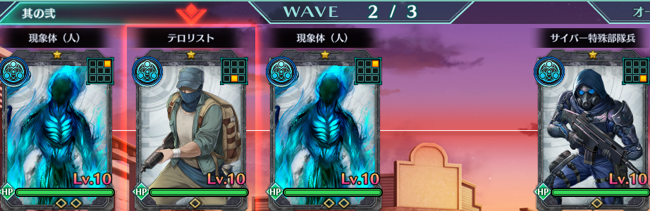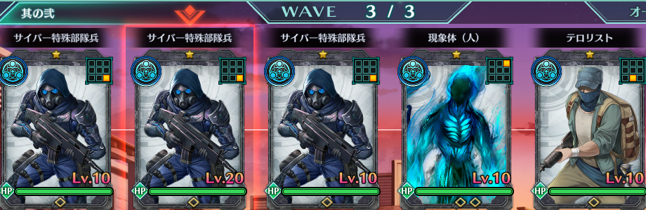 Wave3 | テロリスト:青 x1、現象体(人):青 x1、サイバー特殊部隊兵:青 x3 |