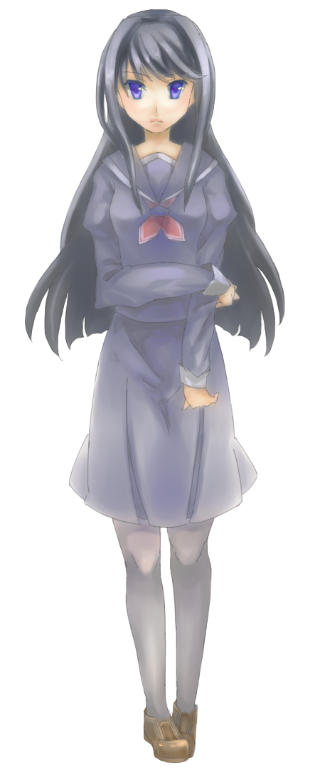 服装 | 黒(紺?)っぽいセーラー服で、脚には黒タイツをはいている、靴は革靴で。 |