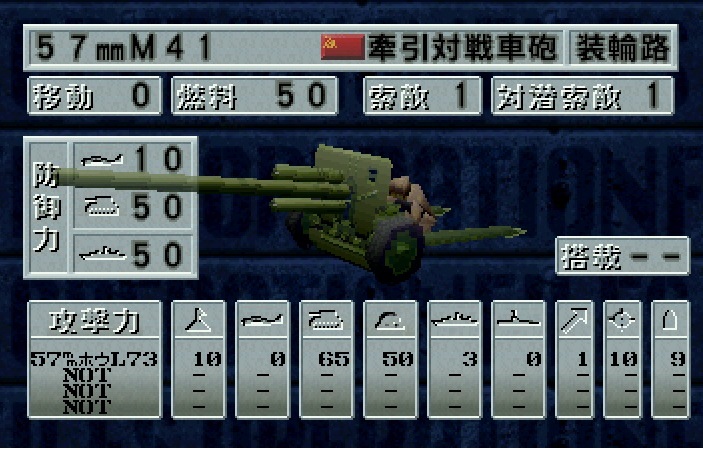 57mm砲L73 | 10 | 0 | 65 | 50 | 3 | 0 | 1 | 10 | 9 | - | - | - | |