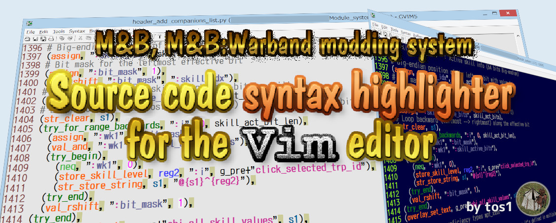 テキスト・エディタ Vim を使って Mount&Blade および Mount&Blade:Warband の MOD 開発システムのソース・コードを編集中に、失敗可能(Can-fail)命令と そうでない命令、各レジスタ、変数などを色分けして表示。
