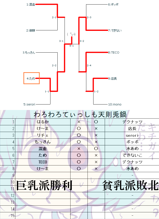 zipさん腹痛により貧乳派が不利に!ジリ貧の中、ついに弦月の会が止めを刺した。やっぱりヤクザ。
