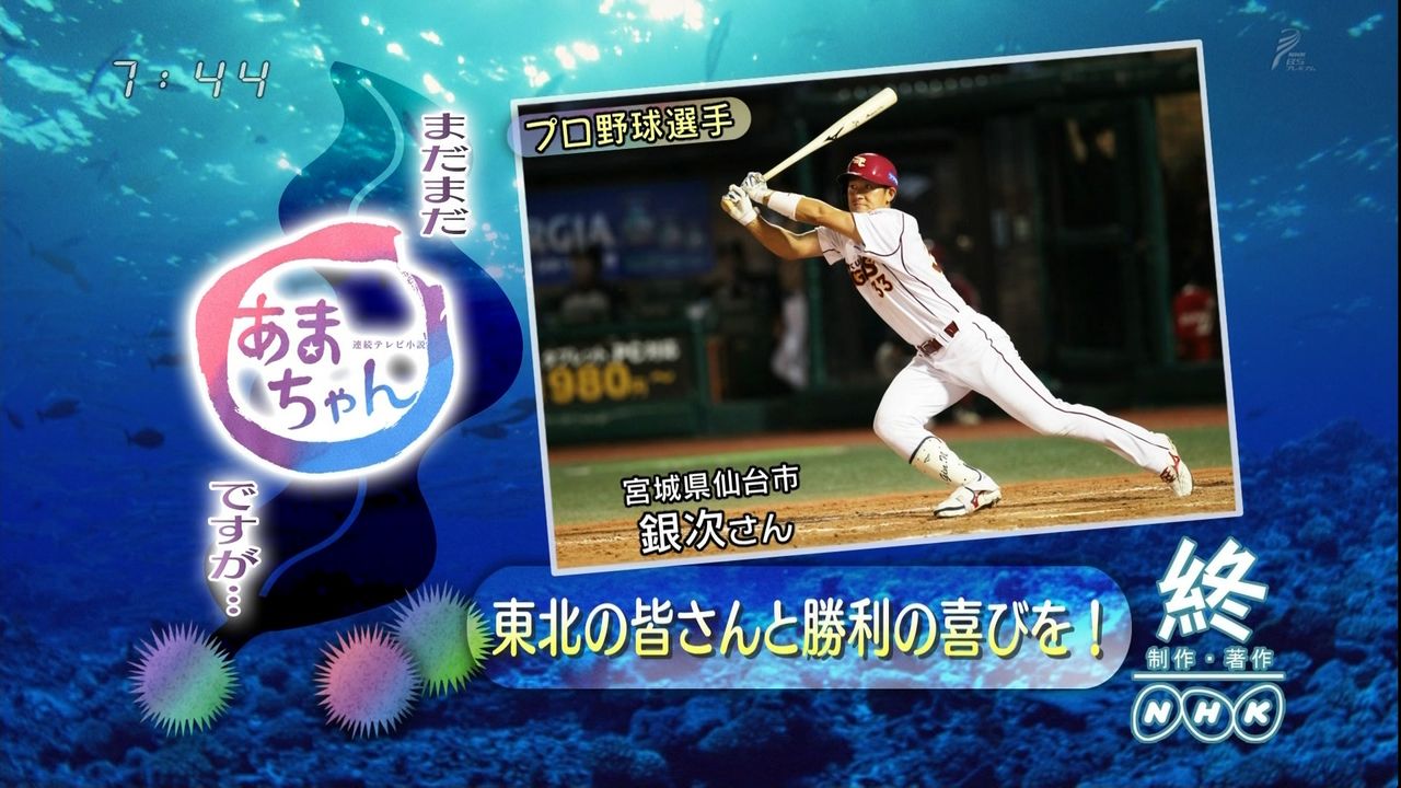その結果あまちゃん9月16日放送分にて「プロ野球選手 宮城県仙台市 銀次さん」という名義で取り上げられた。- 余談だが岩手で開催された楽天のホームゲームでは銀次の応援歌にあまちゃんのOP曲が使われていた。