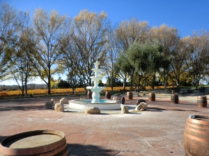 敷地に入っていくと、葉っぱが黄色く色づいた葡萄畑に囲まれた、白い建物が見える。