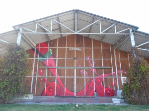 Justinの次に訪問したのがここL'Aventure。未舗装の道に分け入りつつ進んで門を過ぎ、しばらく行くとポップな絵の描かれた建物が見えてくる。