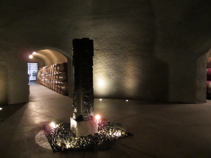 その後、カーヴを見学。幻想的な雰囲気を醸し出すオブジェは、表面に水が流れていたが、これもカーヴ内の湿度を保つためにやっているのだそうで、伊達ではない。ひんやりしていたが、空調は全く使っていないとのことだった。
