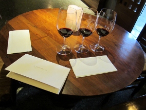 最後に、いくつかの椅子やテーブルが並べられた部屋で、座ってテイスティング。飲ませてもらったのは、2006~2008年の”Quintessa”。3つのグラスで、Side by Sideで飲ませて貰える。
