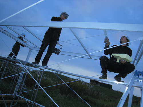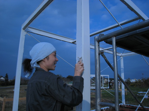 午後本塗りの続き。ほうきだ、元木イン。取り残されたシーリングをスクレパーで掃けながら。