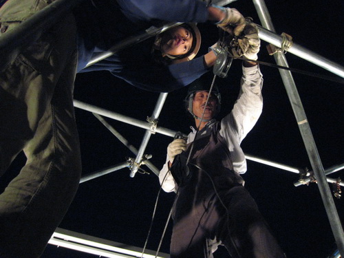 荷づくって現場へ。 夜中作業が癖になっているせいか、エンジンの始動に時間がかかった。 単管の向きを反対に組み直す。ここで昨日のノウハウが生かされ、ウィンチ2台を平行にし、1台は上方向、もう1台は横の引きづり之役割をわけてウィンチを組み合わせることにした。