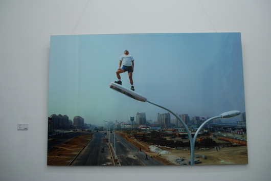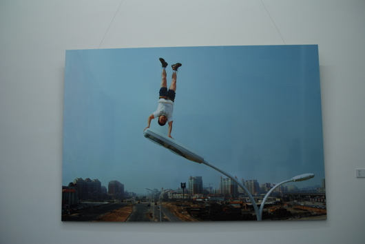 1970年生まれ、Li Weiの作品。合成ではなく、実際に作家が細いワイヤーをつないで逆立ちしている。