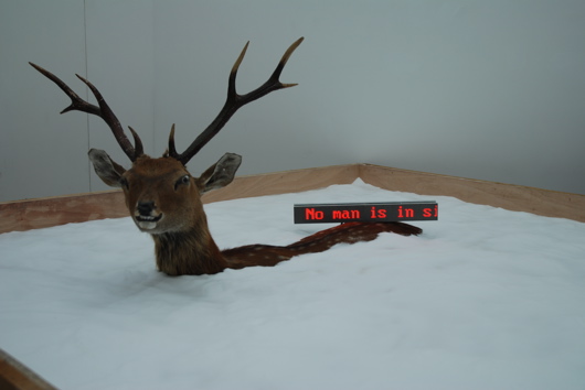 塩の中に鹿のはく製を埋め込んである。全ての道はローマに続く.とは限らない、と文字が流れる。Jiang Changwu 1969年生の作品