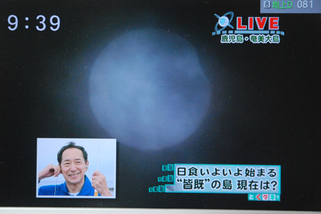 北海道教育大のピンホールの授業の初日である7月22日。皆既日蝕と全国的に部分日蝕が見られる日だった。岩見沢では午前中に雲の切れ間からせんべいを一口噛ったような形の太陽が見えました。授業で木漏れ日のピンホール現象について話しをしようと思っていたのだけれど、ハッキリ見えなくて残念。
