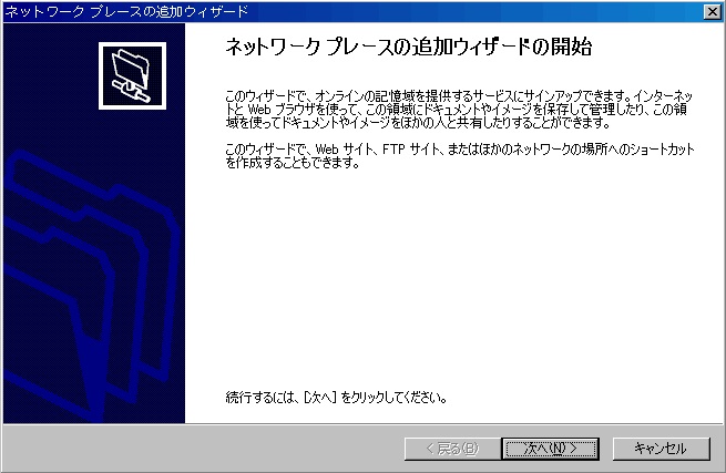 2.「ネットワークプレースの追加ヴィザードの開始」というウインドウがでてきます。「次へ」をクリックします。(画像をクリックすると拡大します。)