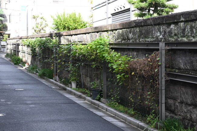 石積みの塀を補強した無骨な鉄骨に葉っぱが這っていて良い感じ。